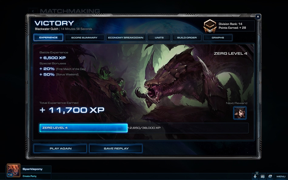 Se pueden ganar bonus como la primera victoria del día con esa raza o el tiempo gastado en obtener la victoria. Por cierto, cada raza es independiente en cuanto a nivel aunque el nivel real del jugador es la suma de todos estos niveles, y este número sale en una esquina del retrato.